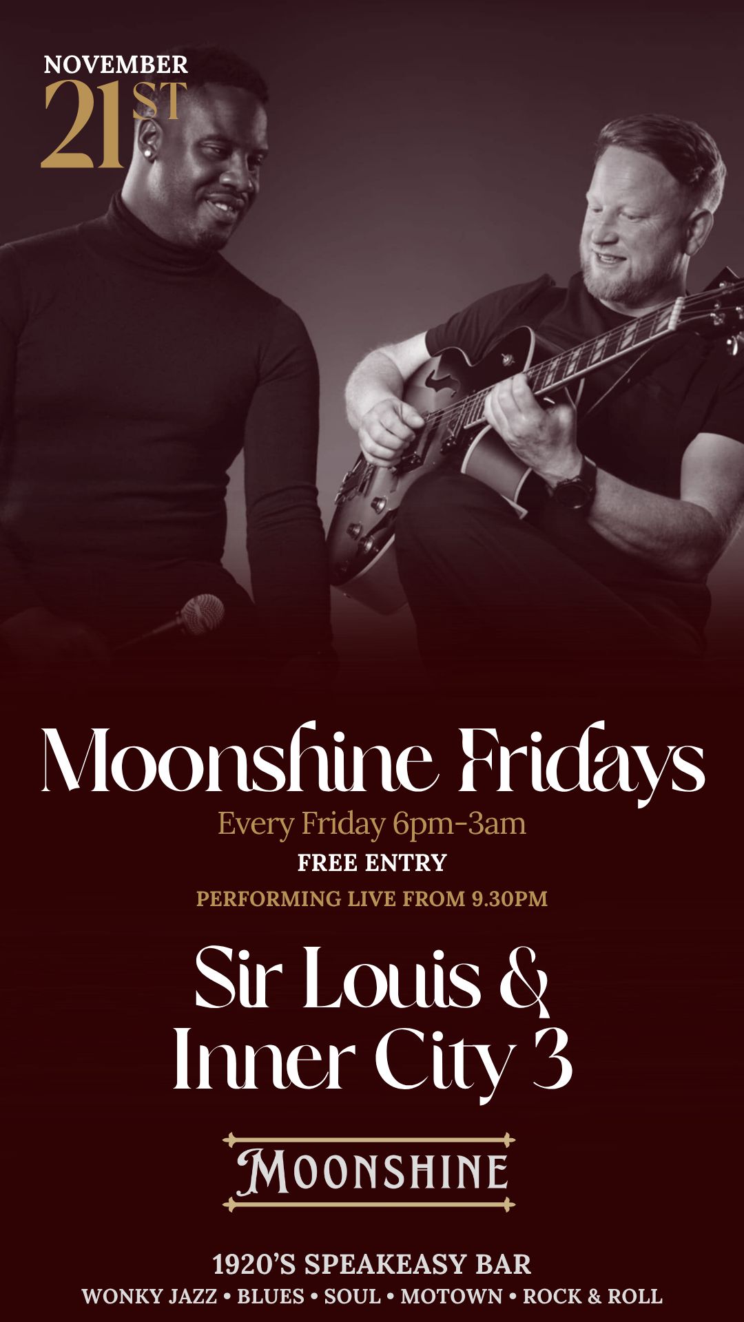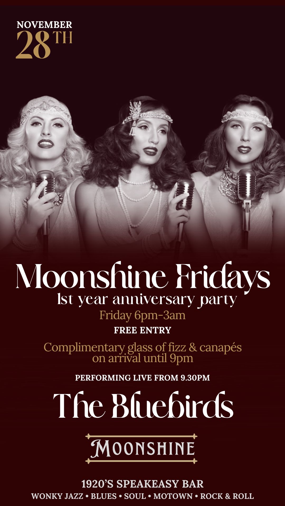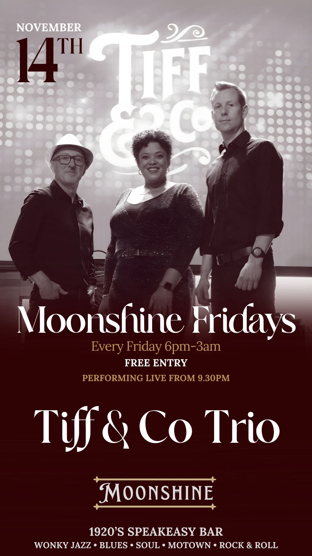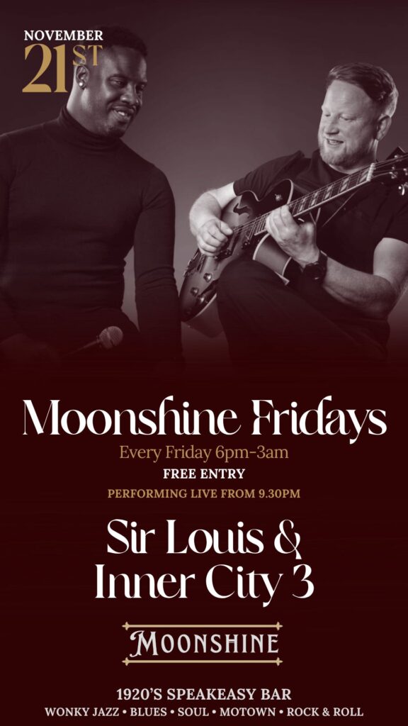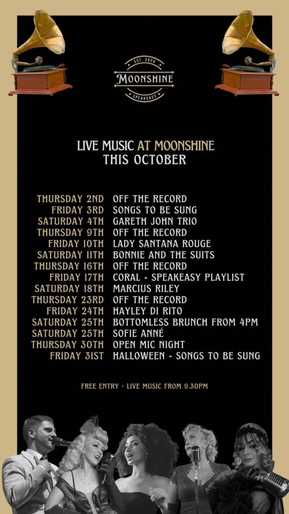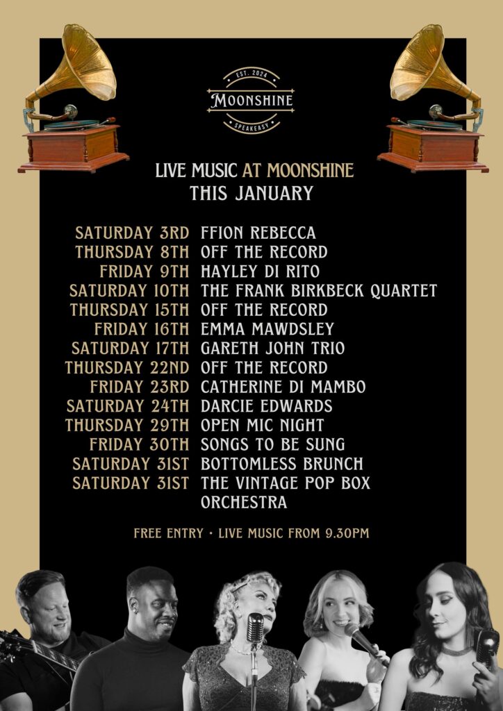 At Moonshine, we pride ourselves on offering an eclectic mix of live performances, featuring wonky jazz, blues, and soul that capture the essence of the Roaring Twenties. Our talented musicians create an atmosphere that transports you to a bygone era, making every visit a memorable experience.
